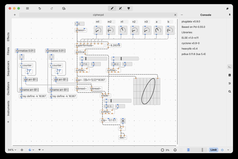 Cyclone 由 Alexandre Torres Porres 主導開發,已經持續了十年。目前的物件庫已經讓 Pd 追上了 Max 7 的水準——考慮到現在 Max 已經到第 9 版,這依然是了不起的成就。