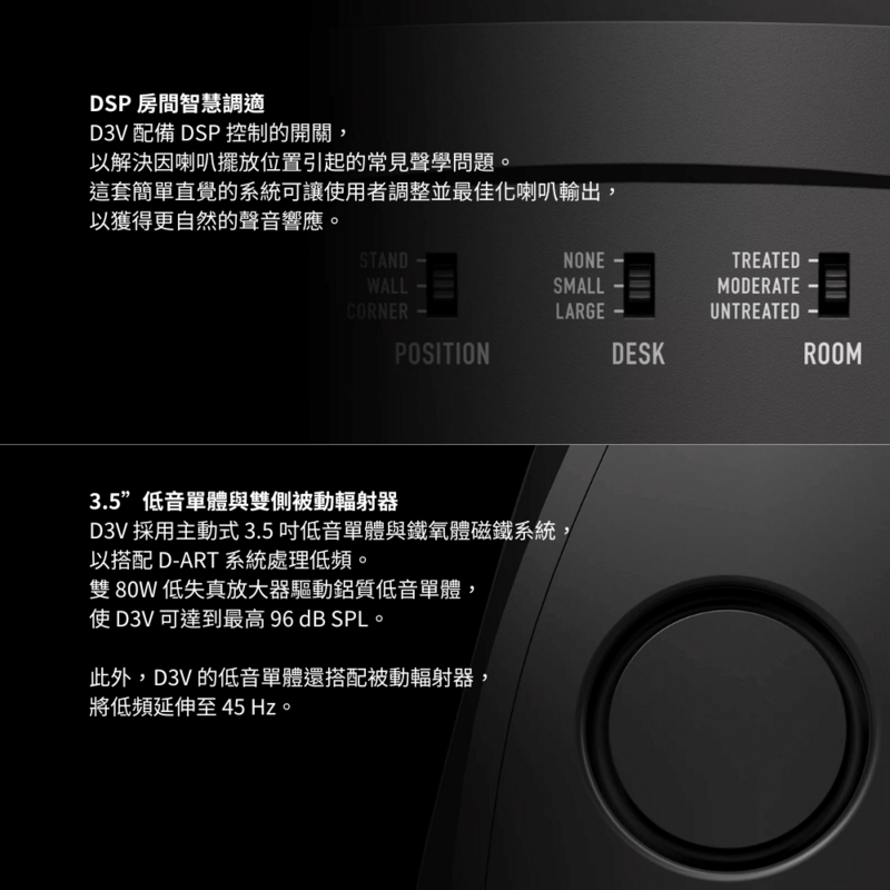 D3V 是一款全主動式桌面監聽系統,延續 ADAM Audio 的工業設計傳承,搭載經典的 AMT 高音單體。每對 D3V 配備 3.5 吋鋁質低音單體與鐵氧體磁鐵系統,並由強勁的 240W 總功率放大器驅動。此外,雙側 3.5 吋被動輻射器強化低頻表現,使 D3V 低頻可延伸至 45 Hz。