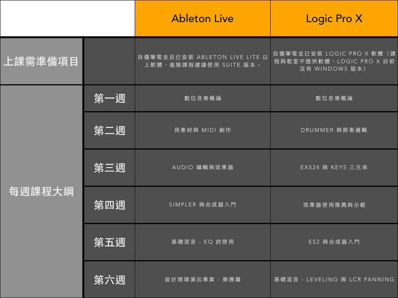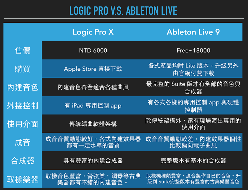 以下列出兩套主流編曲軟體不同之處,提供學生入門編曲 / 數位音樂的參考。