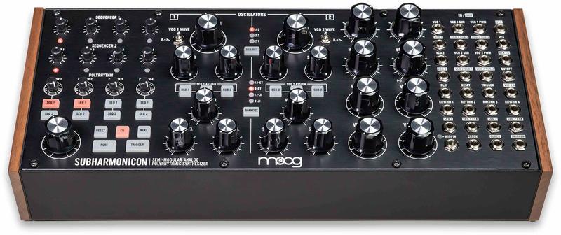 Moog 的 Subharmonicon 音源型合成器,具有兩個 VCO,四個 subharmonic 引擎,兩個 4-step 序列器以及四個節奏產生器。可以善用他 32-poiont 的 Patchbay,外接其他模組化合成器或半模塊化合成器(像是 Moog Mother 32 或 DFAM 等等的器材)。
