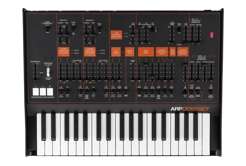 Korg 復刻經典的 ARP Odyssey 全類比合成器,其發聲模式可在 monophonic / duophonic 間切換,其最顯著的特徵是尖銳且具衝擊感又充滿變化性的音色。還能切換三代不同版本的濾波器,依照需求看是要做有尖銳感聲響的 Lead 音色 或是沈穩有力的Bassline,這些獨特的濾波器都再次被完美重現。
