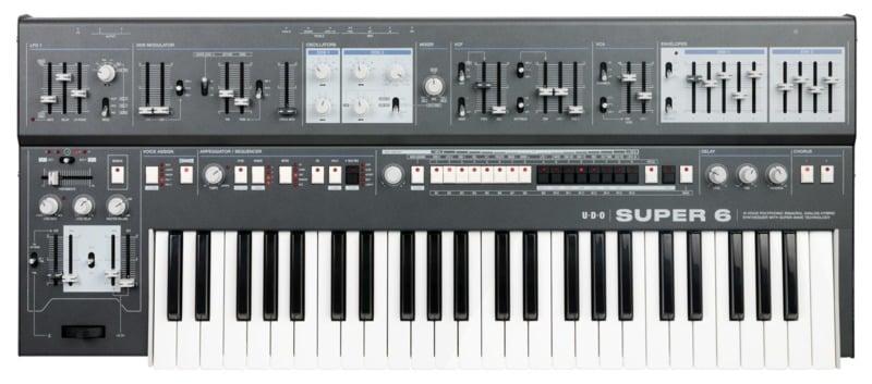 UDO - Super 6 是一款 12-Voice 的 Polyphonic 複音 Hybrid 合成器,搭載特殊的 Binaural 類比混合合成技術,線路邏輯主要由一對業界先進的 FPGA 數位振盪器以及類比的 Voltage Controlled 電路混合而成,因此提供 Super 6 足夠彈性並能快速調整的溫暖類比聲響。由於 Super 6 的 VCO 搭載特別的 Super Wavetable ,透過手動調整 Waveshape 以及 Modulation 等都可以獲得相當特殊且複雜的聲音質地。