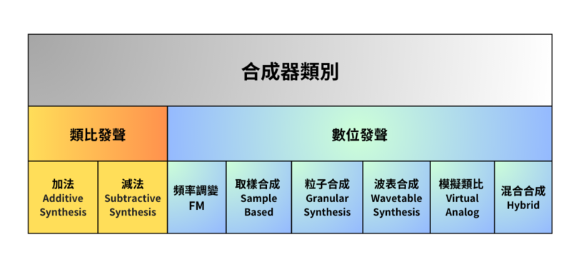 數位生成音色的合成器其共同特色為其振盪器發聲方式是以電腦運算方式產生,而不是透過真正的電壓在類比電路裡控制類比訊號產生聲音。數位合成器若從聲音生成的方式來做區分有可以有以下類型: