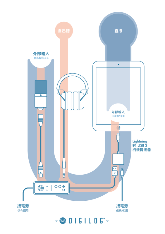 如要將 iPAD(或 iPhone)連接直播器材,最必要的東西是 Lightning 對 USB 3 相機轉接器。這款轉接器可多出一個 Lightning 孔並連接電源線充電,以免直播到一半裝置沒電,USB 端連接直播器材(錄音介面等等),錄音介面一樣輸入接上麥克風,輸出接上耳機(為了 Direct Monitor 使用)。背景音樂則可以使用 Loopback 功能,手機邊播音樂邊直播,使用一台即可!當你的器材沒有 Loopback 功能時,則另需外接音源,這就是為什麼常常看見大家使用兩台行動裝置來直播。