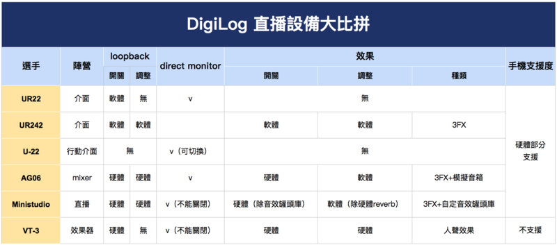最後,Roland VT-3 則是台人聲效果器,但帶有簡易的監聽及loopback,基本上可以支援直播的需求,且在處理人聲這個功能上獨樹一幟,也可以作為選擇之一。