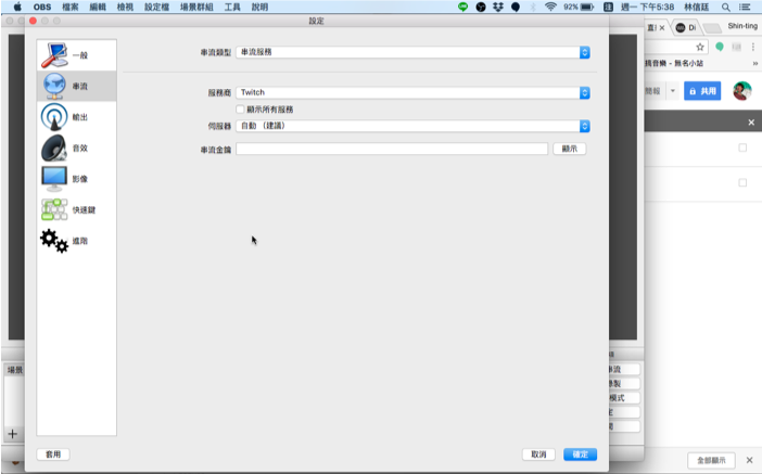 打開 OBS 到設定 -> 串流 -> 透過 Facebook 或 Twitch 取得金鎖 -> 輸入到 OBS 上
