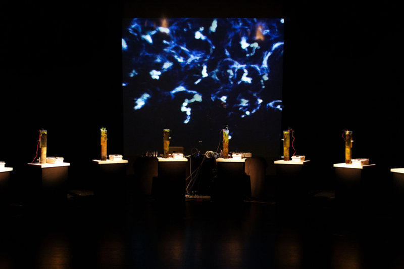Technology is a tool to help human exploring the world and transferring into artworks. In Ahn's early artwork <Ecstatic Network>, she used algorithms to create an interactive audio-visual. Instead of showing a beautiful visual and composite sound with certain rules, her intention was to build up a small world as a network of social and biological system such as a microorganism. The concept that building a system reminds me of a performance I saw - <Sonomatter>. It is a well-known sound installation performance from Ahn. The artwork was developed of building a Winogradsky Column. Every plastic glass column is a small ecosystem, which is filled with pond mud and water and left under sun or artificial light exposure until it contains a lot of bacteria and appears in many colors. In <Sonomatter>, the  Winogradsky Columns are a Microbial Fuel Cell (MFC) which can generate electric signal. Through the circuit to the computer, the electric signal from Winogradsky Column can be transferred into sound and light. It is a new experience of turning natural energy into artworks.