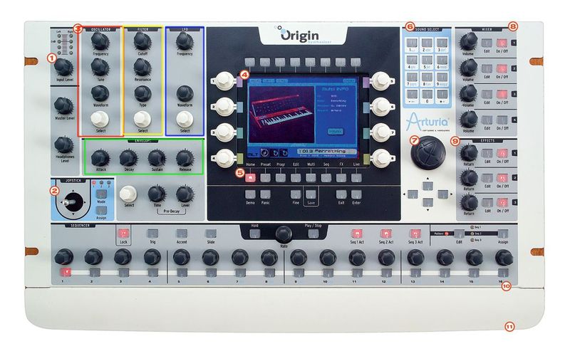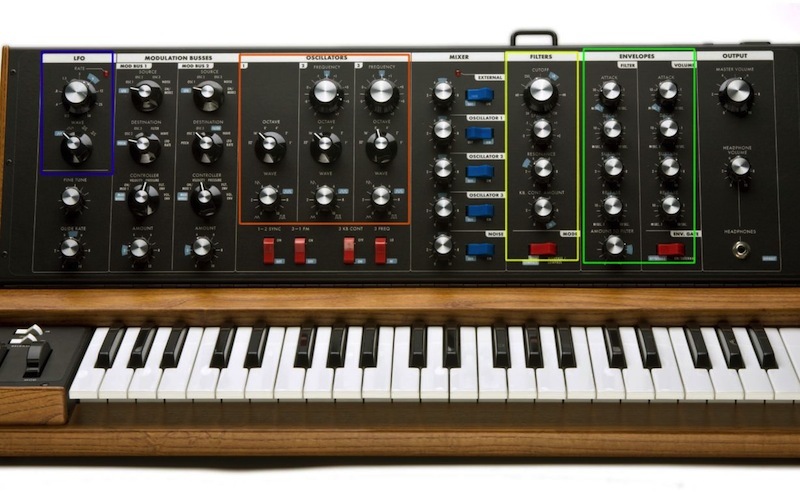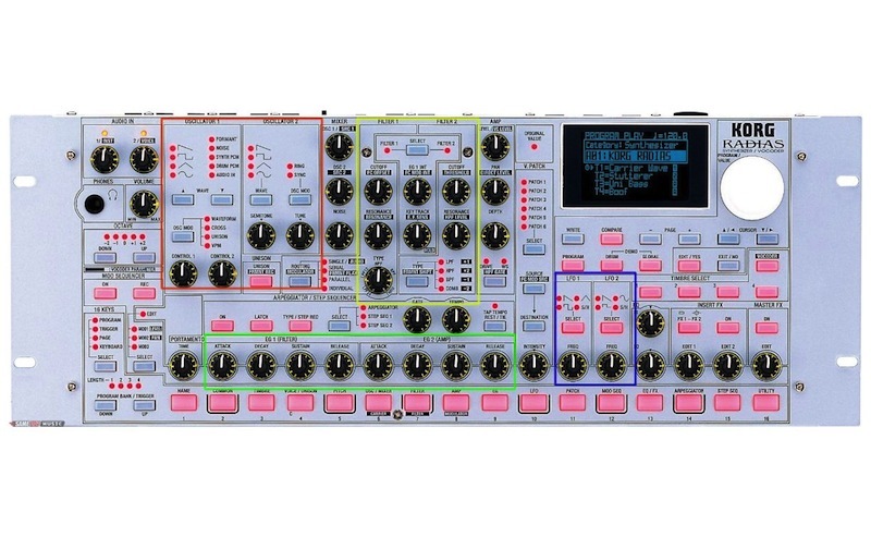 以下我們就貼一些合成器的介面,並且把四大區塊用顏色劃分:OSC(紅), Filter(黃), Envelope(綠), LFO(藍) 一起來找找看他們在哪吧!
