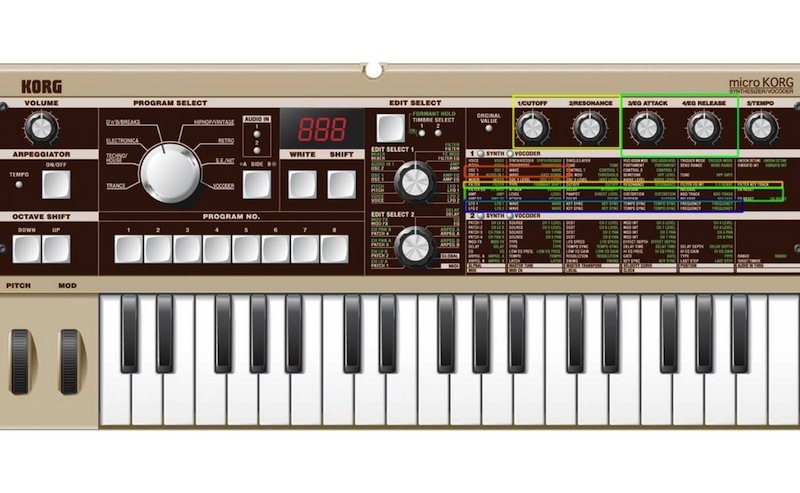 microKorg 這台經典機,雖然修改序號要瘋狂的換頁,不過四個熱鍵旋鈕卻很貼心的對應到常用的參數上