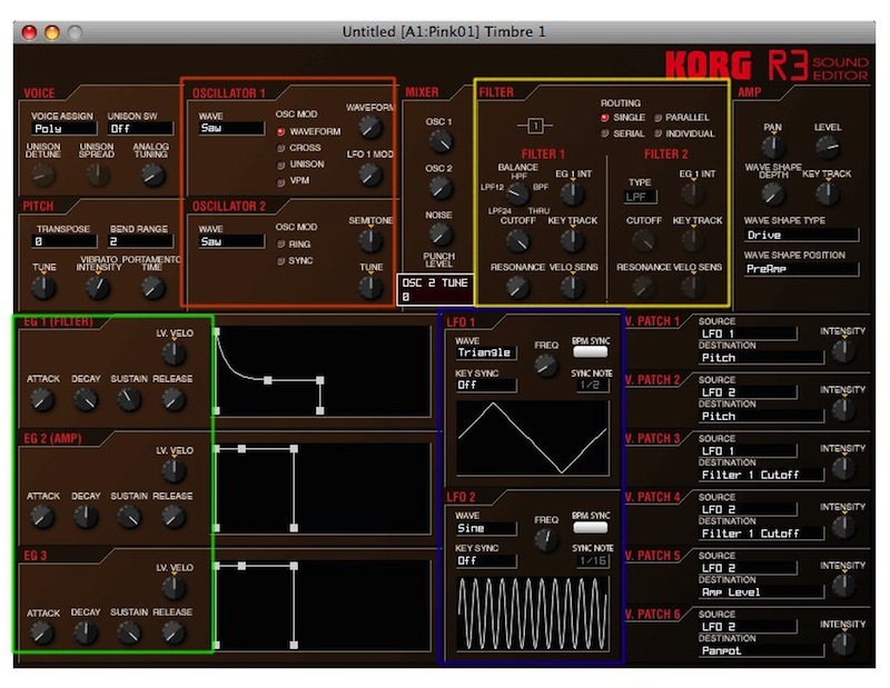 Korg R3 的編輯介面 (順帶一提 microKorg XL 的軟體也是長這樣) 注意到 Env 被寫為 EG,是 Envelope Generator 的意思,不要忽略他了!