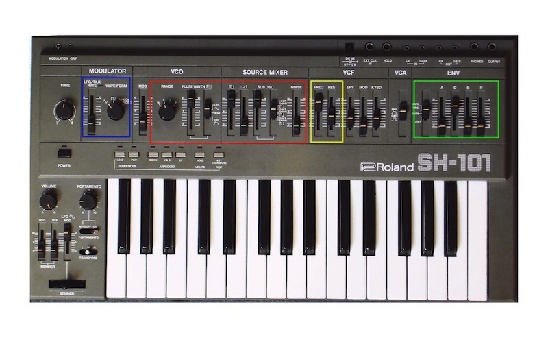Robert Hood 愛用機 SH101, 因為是類比的關係 OSC 與 Filter 分別顯示為 VCO 與 VCF,LFO 藏在 modulator 的底下。