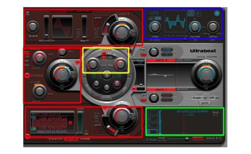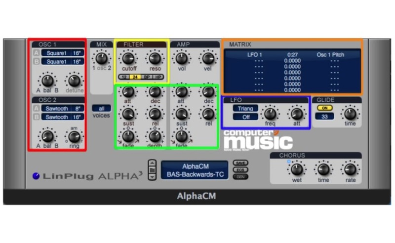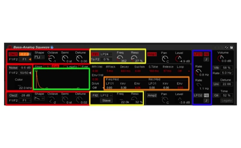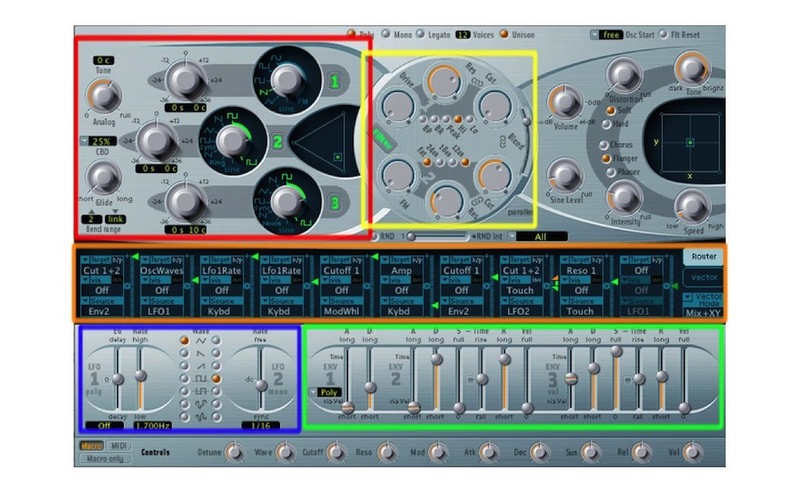 與上一篇相同,四大部位元件以顏色區分為 OSC(紅), Filter(黃), Env(綠), LFO(藍), 並且加上第五區 route, 即 modulation 的路徑以橘色表示。