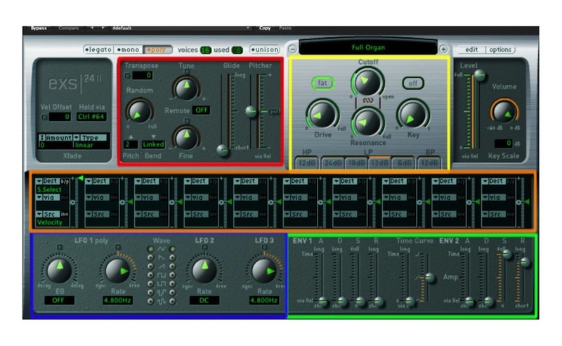 Logic 引以為傲的強力取樣機 EXS24 的介面,兩組 Env 三組 LFO 讓使用者自由地在 router 裡嘗試各種可能性,是我個人非常常用的一組軟體。