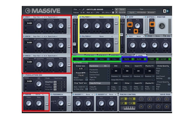 Native Instrument 的模擬類比合成器 Massive 聲如其名,四個 Env 兩個 LFO 讓他看起來有些複雜。route 的方式有些特殊,是直接把綠色或藍色框框內的元件拉進橘色小方格中,並且在橘色小方格用滑鼠上下拖曳來調整控制深度。用習慣的話會非常喜歡這個設定,尤其是調整深度時旋鈕旁會有一條彩色的指引看起來滿厲害的 XD