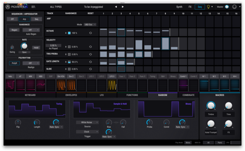 有三個 LFO、三個 envelope、三個不同的 random 及 function generator 等,13 種高品質的 modular 效果處理器,包含 reverb、chorus 及 多種 distortion 效果;再透過多重節奏的 sequencer 處理。和其他的 wavetable 合成器不太一樣的是,Pigments 的聲音偏 cold 但有更豐富的泛音。