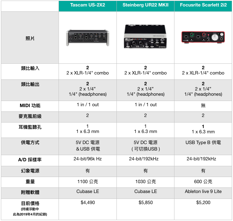 除了 Steinberg UR22 MKII 跟 Focusrite Scarlett 2i2 之外,也可以考慮 Tascam US-2x2,是一個 CP 值蠻高的錄音介面啊!