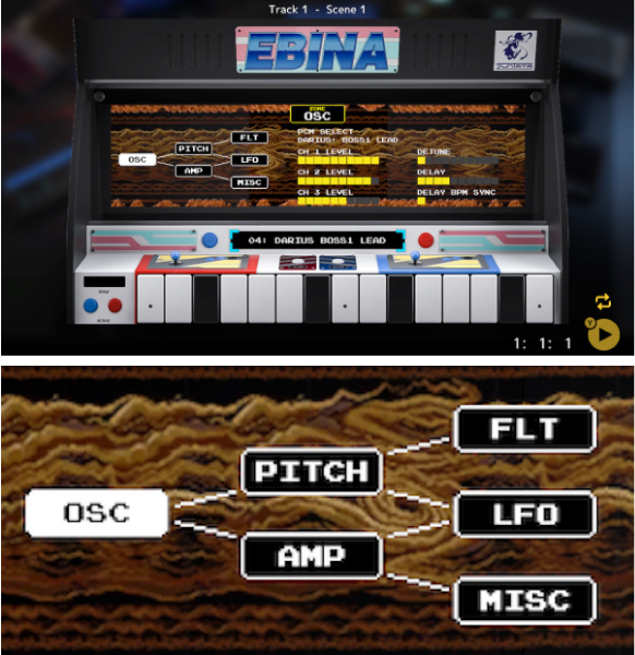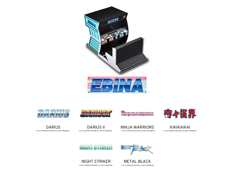 Taito(株式會社太東)的電玩街機合成器則是以 Ebina(日本海老名市)命名,操作介面模擬復古的 Darius 電玩街機,取樣了包含 Darius, Ninja Warriors, Night Striker 等六款代表性遊戲的多種 FM 合成器音色,還有多種 filters, LFOs 及效果器或以堆疊 FM channels 的方式做出 Detune 和 Delay 的效果。
