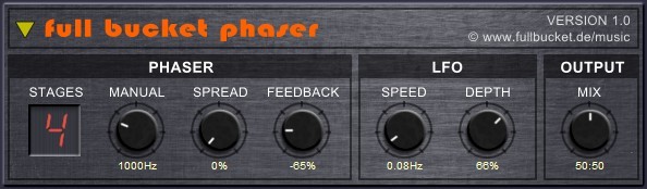 Full Bucket Music 的 Phaser Plug-in 有經典的類比 phaser 音色,最多可至 8 stage ,含有 LFO modulation,並且為雙聲道音訊。使用 C++ 語言編寫,有高度的表現能力配上極低的 CPU 耗能,並且支援 MAC 及 Windows 系統。