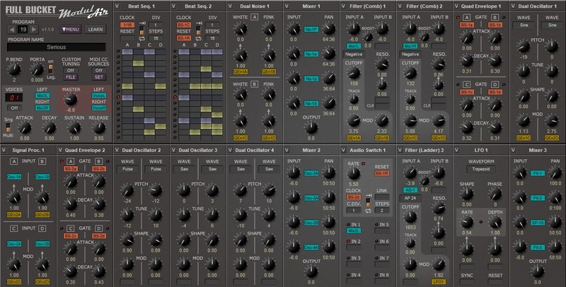 ModulAir 模組合成器音色組則是還正在製作中的 Plug-in,目前還有一些古怪的預設以及龐雜的資料,特色如下: