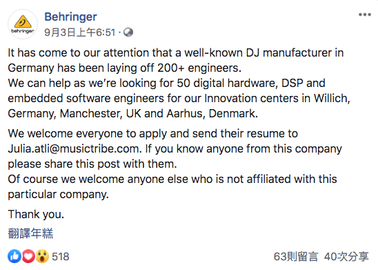 另外在此同時,Behringer 在 Facebook 上直接發佈了徵才的資訊,在威爾斯、德國、曼徹斯特及阿爾路斯的辦公室徵求數位硬體、DSP 及嵌入式軟體工程師等人才。
