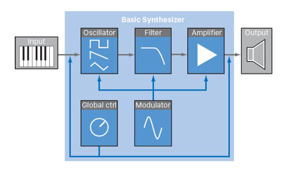 減法合成原理:MIDI 訊號輸入音高至振盪器產生的波型,再經過濾波器、放大器,還可透過其他 modulation 調變音色。