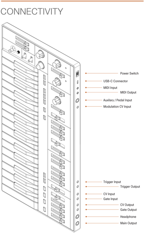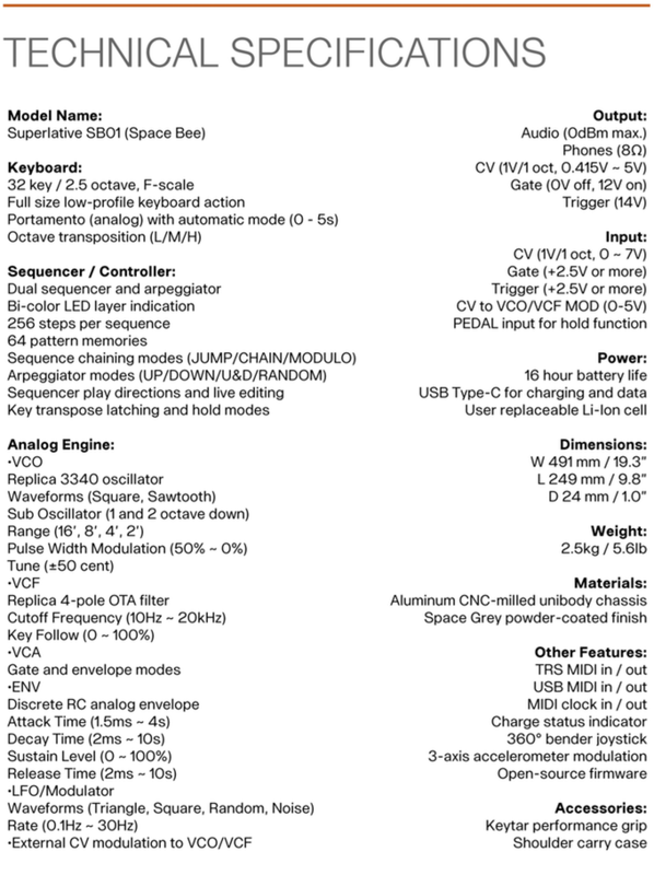 SB01 是目前世界上最薄、第一個可充電式的類比合成器,有著新型態的外表,與 Open Music Labs 合作製造出 1 比 1 版本的電路, 3340 電壓控制振盪器搭配上 4-pole OTA filter 製造出具有標誌性且不會出錯的聲音,使他與靈巧的類比 envelope 、modulation 和 portamento 做呼應或是加入額外的 CV ,可進行更深入的 VCO、VCF 控制。