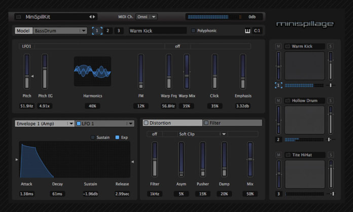 提到免費的鼓機 plugin 一定會提到的 MiniSpillage,一款合成器、鼓音色的 plugin,目前仍然只有 Mac 平台上能夠使用,為 AudioSpillage 出的另外一款 DrumSpillage 的精簡版。他有 3 個 kick drum pad、hat 及 hollow drum。有數種 kit 組合以及合成器的音色調變功能,像是 LFO、Filter、modulation 和 distortion,能夠將音色做更多延伸及變化。MiniSpillage 已經推出一段時間,不過仍然有推出幾次更新讓它仍然維持是 Mac 平台上最佳的鼓機 plugin 選擇之一。