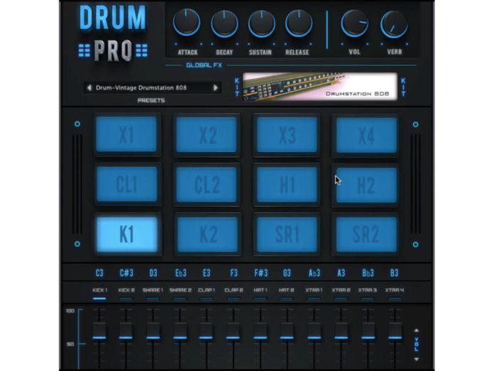Drum Pro 是一款先下載軟體後才付費購買(更多)音色組的 plugin,但它確實提供了大約 20 種取樣音色,來自 9 種鼓機(像是 Roland、Boss、Novation 還有更多),你可以完全不經操作的就獲得一個非常良好的起頭。操作介面採用了 MPC 風格的 pad 及基本的 mixing 功能,能夠 cover 你的基本需求,而當你需要更多的時候,也還是有他們的付費組合可以做選擇。