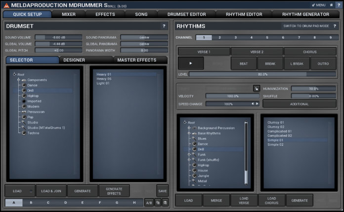 MDrummer Small 目前似乎不是 MeldaProduction 的主推產品,但你仍然能夠在他們網站上的 download/archive 部分找到。有百種的鼓組、multisample、旋律以及 loop 包含在內,有豐富的音色及組合選項可供使用,即使覺得不足也仍有付費選項(MeldaProduction MDrummer),可以趁它(可能)被下架前抓緊機會下載。