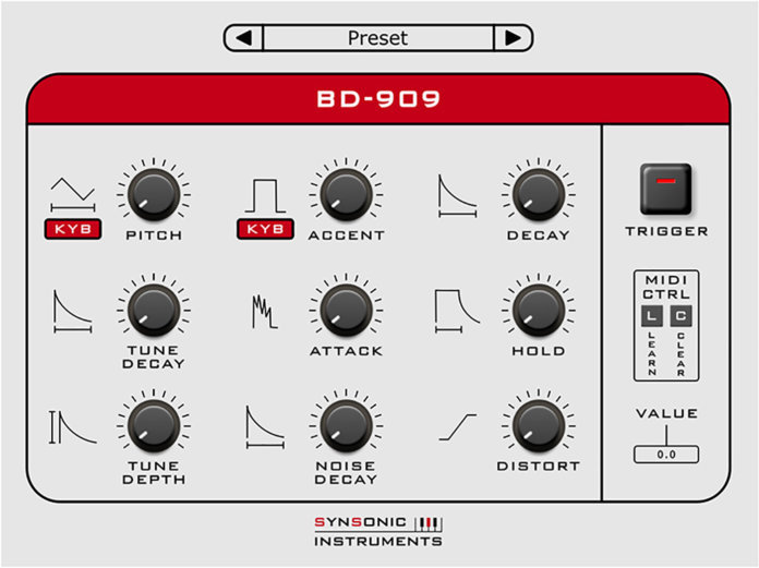 這是一款仿製 TR-909 音色的 plugin,雖然僅有仿製 909 的 kick 音色,但 TR-909 的 kick 音色已經被廣為使用在多種舞曲之中,已經形塑出一種經典的形象,能夠輕易的上手製造出某種音樂風格;也有 16 種的 preset 可供使用。