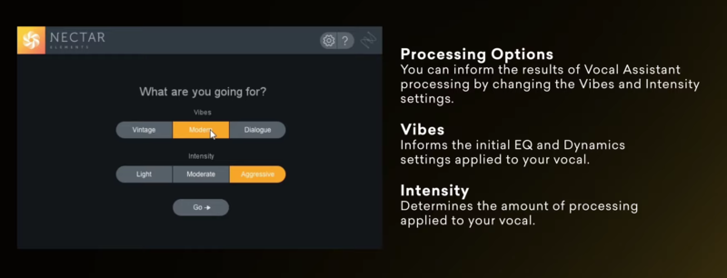 iZotope Nectar Elements 雖然只是正式版 iZotope Nectar plugin 的 lite 版本,但依舊非常容易操作且實用。使用了機器學習科技 ( machine learning ) ,首先針對不同的人聲特性運算出專屬的 preset ,接著可以依照聲音風格還有想呈現出的感覺,分別在 Vibes 模式中選擇 Vintage 、Modern 與 Dialogue 以及 Intensity 模式中選擇 Light 、Moderate 或 Aggressive 。最後則是六個推桿 Pitch 、Clarity 、De-ess 、Dynamics 、Tone 、Space ,依照個人喜好做調整。