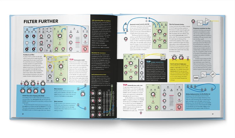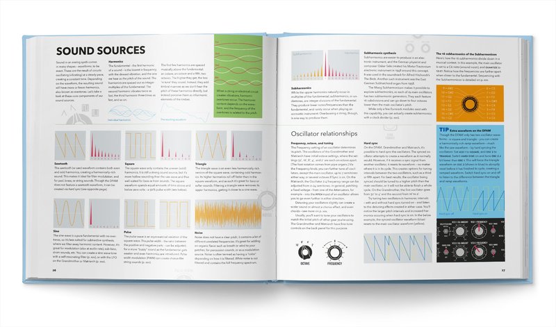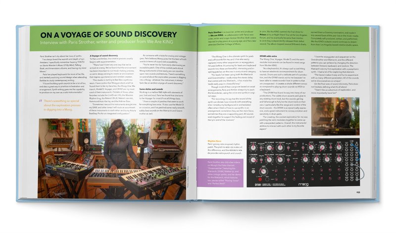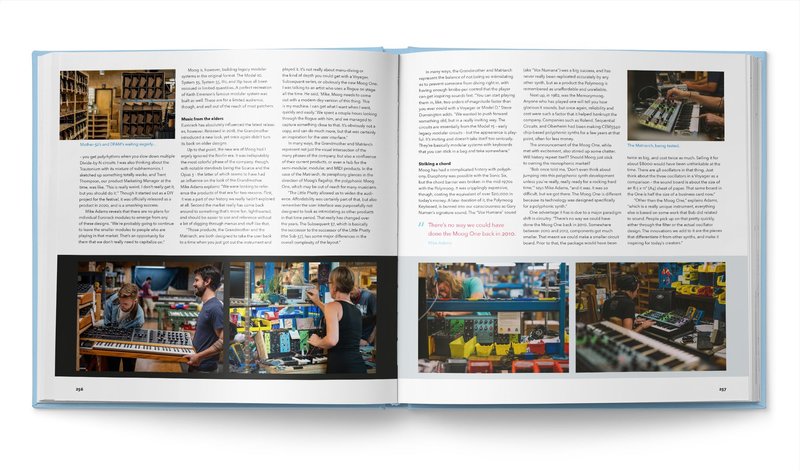 在書中實際操作的部分將會使用 Mother-32、DFAM、Subharmonicon、Grandmother 32 和 Matriarch,這些都是完全類比的半模組化合成器,不論有沒有透過 patch 都可以使用,對於剛開始接觸的使用者或是進階的合成器玩家都可以找到自己的玩法。還可以看到 Moog 位於北卡羅來納—阿什維爾的工廠內製作狀況,這些樂器都是經由手工製作,以及 Bob Moog 發明這些樂器的沿革。