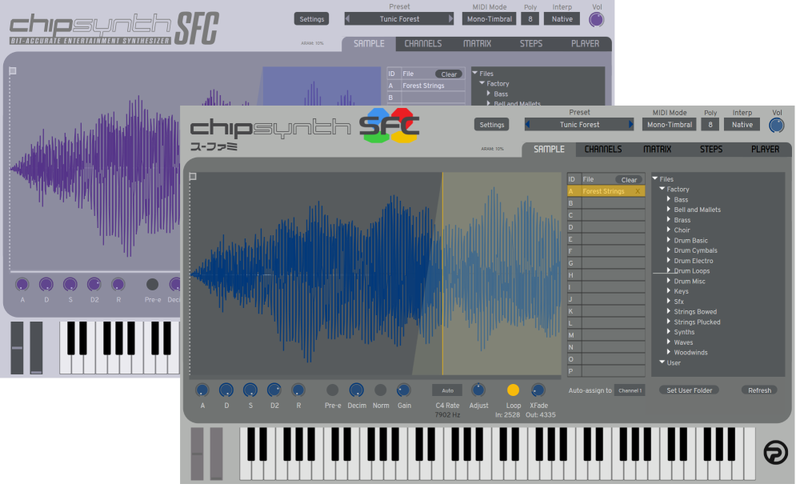 有著如初代超級任天堂般的銀色光澤外觀, SNES 的復刻軟體在 Plogue 工程師的努力下誕生。這台名為 Chipsynth SFC 的軟體在開發工程上花了許久的一段時間,因為主工程師試圖想完美復刻當年僅有 16 位元處理器的聲音樣貌,這項逆向工程十分複雜。