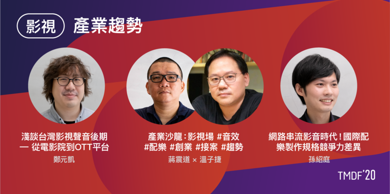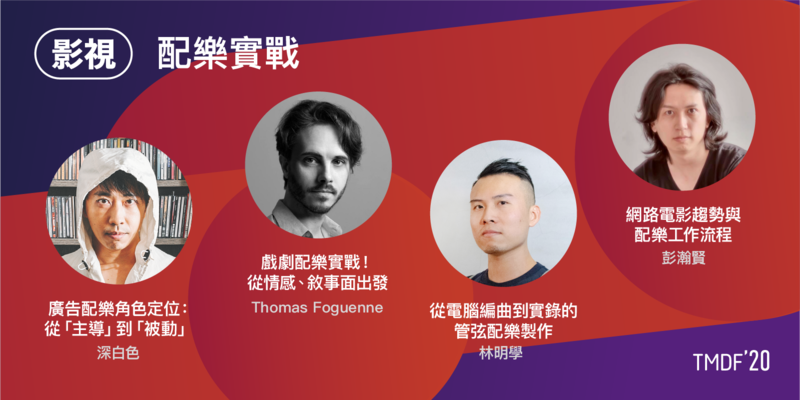「影視」主題由知名廣告配樂家深白色打頭陣,戲劇音樂則由金鐘配樂家福多瑪深度解析,留美新銳配樂家林明學亦分享管弦樂實錄經驗。此次更因應 OTT 平台網路電影風潮大起,台灣電影戲劇面臨國際化挑戰的趨勢,將由《魂囚西門》配樂家孫紹庭分析台美製作規格競爭力差異、《重甲機神》配樂家彭翰賢分享中國網路電影發展趨勢與工作流程,以及《罪夢者》音效師鄭元凱說明聲音後期在不同平台的應變,對於了解影視幕後及跟上產業趨勢轉型,場場都精彩不容錯過。