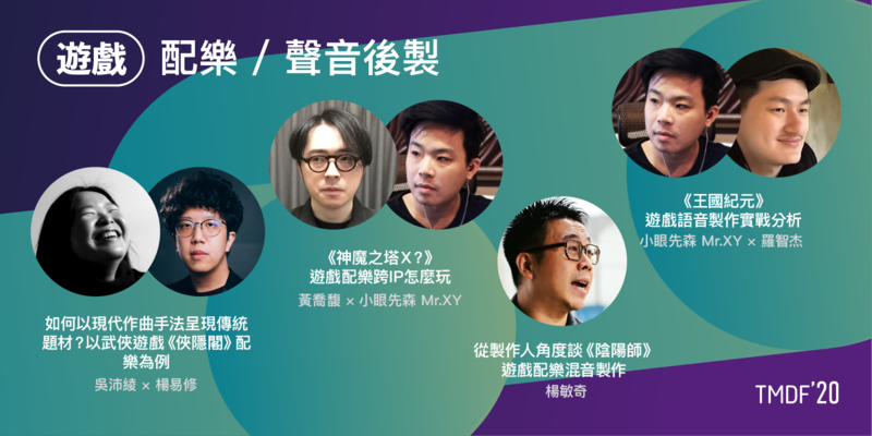 「遊戲」主題除涵蓋了 IP 跨界合作、遊戲語音、配樂混音、編曲手法、中介軟體應用…等實務主題,遊戲企劃、製作人、配樂、音效不同職位也同時參戰,由《Cytus II》配樂家 KIVΛ、《太空戰士》企劃 Bruce、《神舞幻想》音效師吳柏毅、《俠隱閣》配樂家吳沛綾與楊易修、《神魔之塔》配樂家黃喬馥、《軒轅劍柒》音樂統籌甯承信、《王國紀元》配音小眼先森與聲音後期羅智杰、《陰陽師》製作人楊敏奇... 等,產業專家齊聚、保證精彩絕倫!