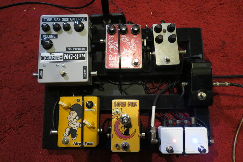 這類破音多為 Fuzz 系列,特別的是由於他們採用音箱頭音色的特性,導致原本常用的 Afro Fuzz 音色較不突出,為了保有 Fuzz 的特色,又希望 Solo 時不會被其他樂器掩蓋,所以加上 Mustard War Pig Treble Boost 做搭配。
