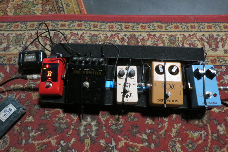 最先被筆者注意到的,是位於最左側起頭的 Marshall 的 Shred Master ,這算是一顆蠻好被認出的 Distortion。接著,往後看去,的確如小茶所說,相較於小茶多使用 overdrive,吉他手詠翔使用的多為 Distortion。「這兩邊是互相配合的。」「Pete Cornish NG-3 Fuzz 配上 Vintage Crowther Hotcake」「Menatone Red Snapper overdrive 配上 Marshall Shred Master」