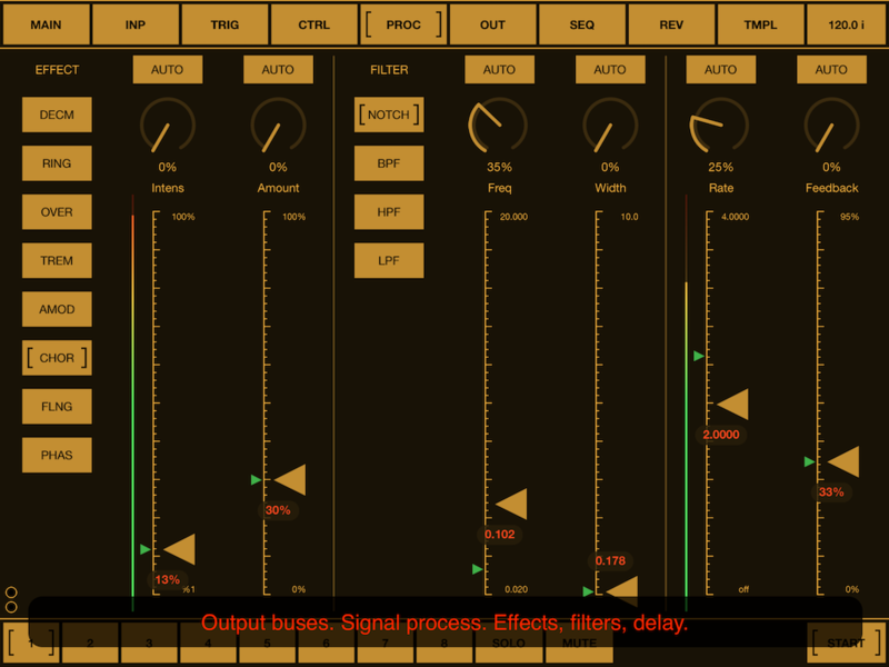 Sequencer 則控制這些聲音元件的回放,也可以與主要的 BPM 同步或是使用 Trigger 中的設定改變拍點。這些調整好的 Sample 會被分配到八個 output buses 的其中之一。最後這些通過輸出的聲音訊號,能夠掛載聲音效果包含 Filter 以及回聲等等 ......。除此之外,這八個 output 訊號可以獨立設置音量大小、立體聲 panning、EQ 以及選擇輸入到主要殘響效果的訊號量。