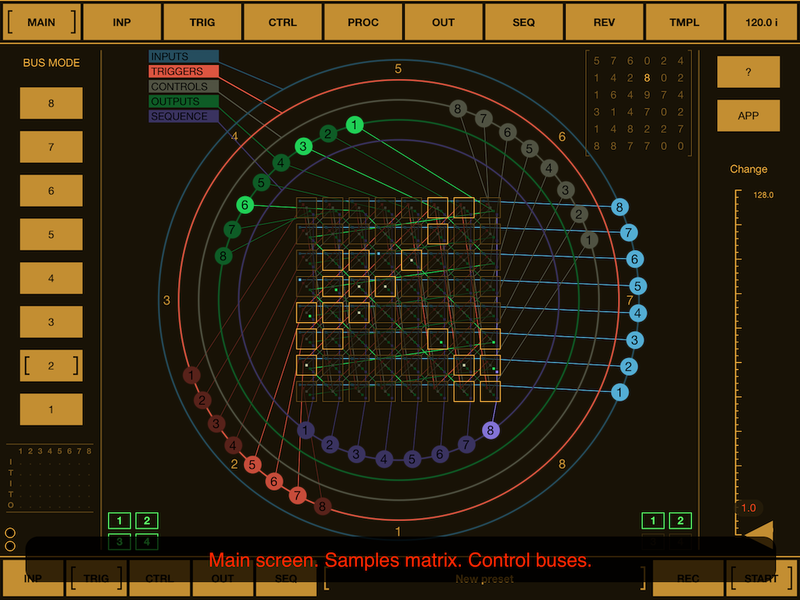這款 app 是這樣運作的,Beatcutter 主要是基於一組 8x8 的 64 個獨立元件而成,每一個元件都可以儲存一組 Sample ,而這段 Sample可以透過 bus 通道來控制五個不同的參數,當中有 Input、Trigger、Control、Sequencer 以及 Output。
