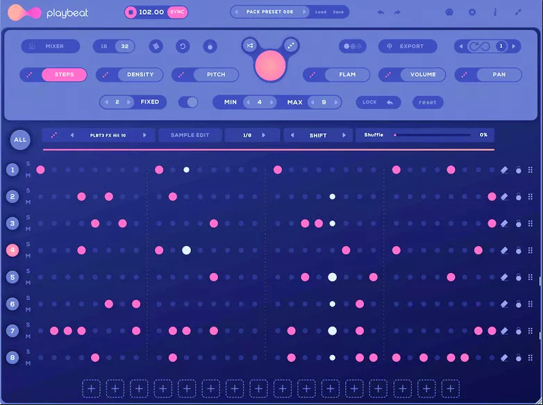 而讓 Audiomodern Playbeat 如此特別的是,它利用 A.I. 演算法來分析當下的 Sequence,來 Randomize 以及 Remix 來形成一整組基於既有節奏而成的全新 Sequence,這邊的 Random 並不是指完全隨機跑動 Sequence,而是會基於既有的節奏來產生多樣、不可預期的全新節奏。