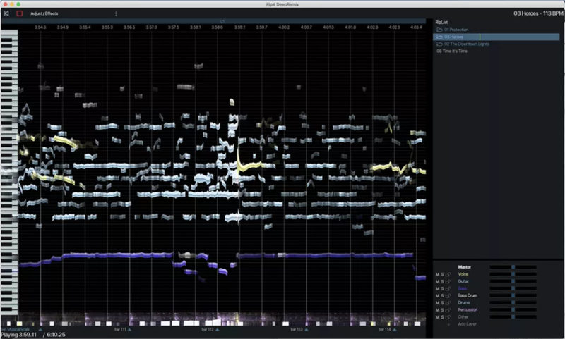 Hit’n’Mix 開發的 RipX 分成兩種版本 — DeepRemix 和 DeepAudio,而這兩種版本都提供了相當的功能:將一整組音樂檔案拆解分析,將不同的樂器部份分離成獨立的 Stem Track。當然,這不可能是完美的,但是透過精準 A.I. 技術分析應用在傳統樂團(人聲、吉他、貝斯以及鼓)編制下確實還是會達到不錯的效果。