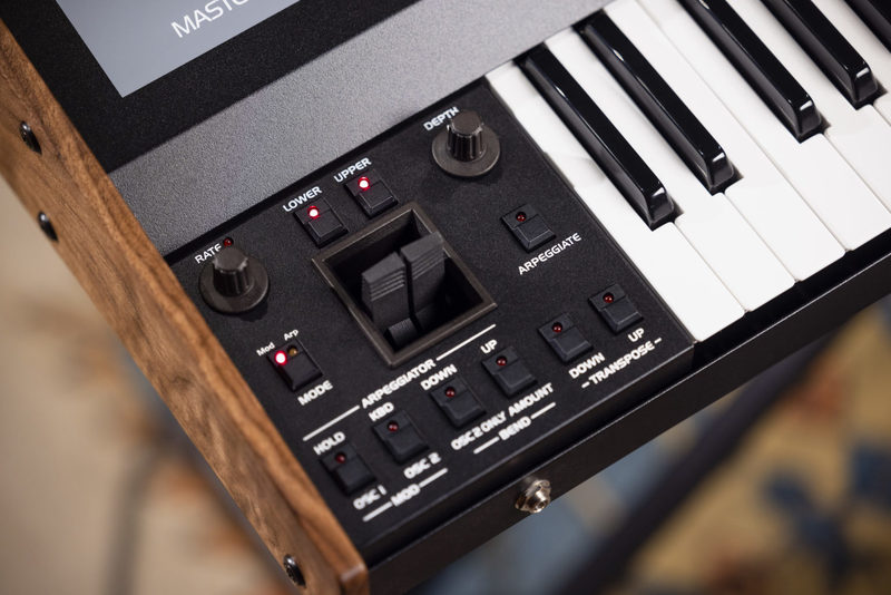 - 左側的 Oberheim 經典音高和調制桿,用於表現性的音高彎曲、顫音,以及連接至琶音器的功能