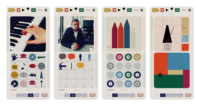 你可以將這些樣本進行排序和混合、現場錄制或層層堆疊,並添加效果。有鼓和旋律模式,共有四個 channel 和 16 個 pattern。對應產生的影像會在上方顯示,也可以為這些影像添加 filter。