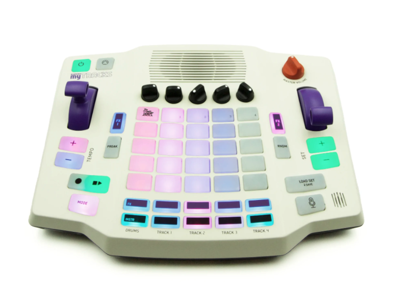 myTracks 的面板上配有 5x5 矩陣的打擊墊,用於觸發聲音和 sequencer 剪輯,帶有一種兒童友好型 MPC 的風格。有 48 種樂器聲音(原聲樂器、電子和打擊樂器),還可以通過內建的麥克風直接進行取樣。