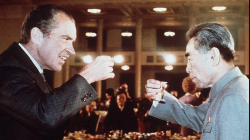 1972 年 2 月,美國總統 Richard Nixon(左)在正式訪問中國期間,與中國總理周恩來(右)一起在北京敬酒(圖片來源:Getty/Staff)。