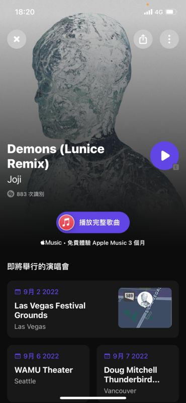 除此之外,蘋果也將歌曲資訊提供的淋漓盡致,除了歌曲、演唱者外,你現在還可以直接看到歌手動態,例如其接下來的演唱會地點、票券開賣時間等等,而這一切都可以使用蘋果服務: 以 iPhone 訂演唱會門票、車票,儲存在 Apple Wallet Ticket 中,並於當日使用 Apple Maps 導引你至演唱會地點。