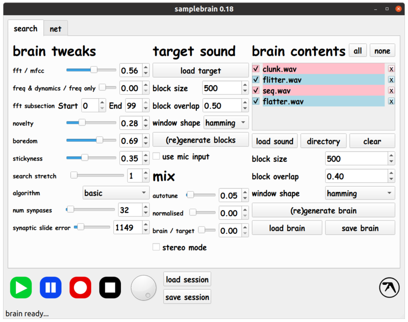 Samplebrain 作為一個聲音 Mesh 軟體,將 Aphex Twin 慣用手法的取樣拼貼方式,直接無私大公開。Samplebrain 會將取樣分解成由許多 "Blocks" 相互連結而組成的 "Brain",並且透過相似度來連結成為一個網路。感覺很難理解,但實際上操作過軟體後,就可以大略的瞭解這樣的聲音拼貼概念,而且完全回想到幾首 Aphex Twin 的作品中,出現過這樣的聲音!