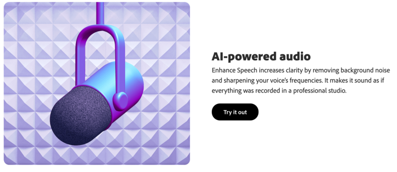 Adobe Podcast 最受關注的功能之一,是一個由 AI 人工智能驅動的增強語音工具,它可以通過消除背景噪音和銳化你的聲音頻率來提高聲音清晰度,並且協助使用者建立良好的錄音環境,像是告訴你麥克風放置的距離,麥克風該設置的音量大小等等。"它使一切錄製的聲音,聽起來就像在專業錄音室錄製的一樣" Adobe 官方聲稱。