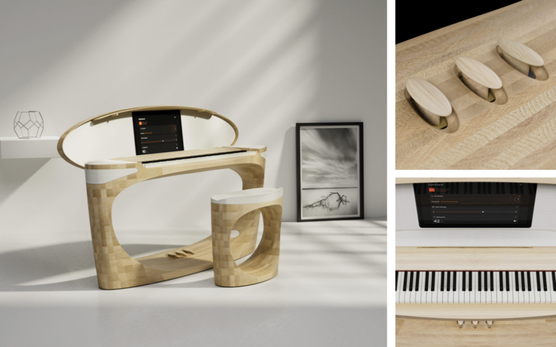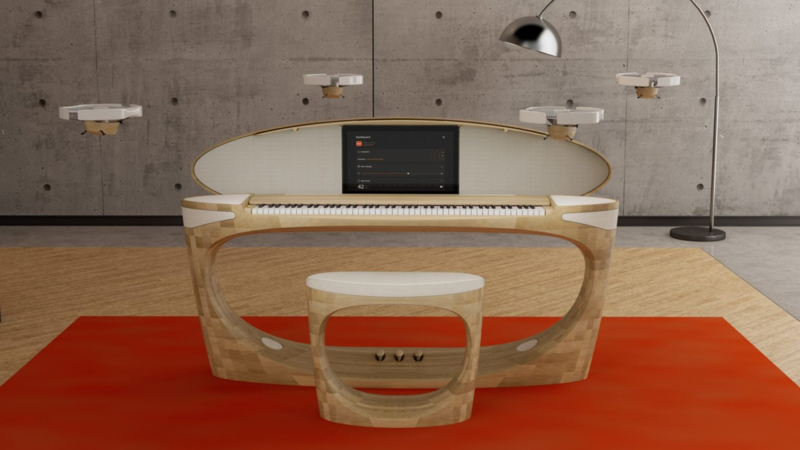 由一體成型的日本橡木製成,與漂浮的無人機揚聲器搭配,可實現真正的沈浸式音效。是的沒有錯,是與飛行無人機搭配,這是一款未提供販售的樂器, Roland 的 50 週年紀念概念鋼琴。這台琴在 CES (國際消費電子展)上展示,是 Roland 公司與日本著名傢具製造商 Karimoku 合作的成果。Karimoku 的展示空間離 Roland 位於濱松的總部很近,除了在一次性的概念產品上合作之外,兩者還共同出品了可以購買的樂器——Kiyola 鋼琴系列。