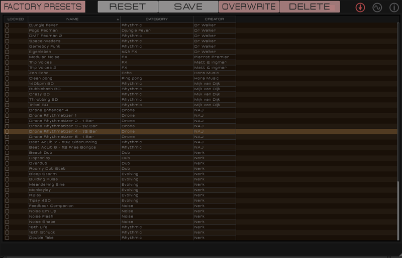 濾波器和 delay 可以被 modualtion 數值控制,從而能夠產生全新的組合。FM 和 AM 控制把這個插件帶入了全新的狂野境界,還有各種三連音和點狀延遲時間的新 groove timing。另一個強大的附加功能是可以修改延遲和濾波器階段之間的路徑,所以能夠很容易地定制踏板的特性,甚至在反饋迴路中插入濾波器,可以完成深層的聲音設。此外,可以將不同的 Patch 儲存下來,可以在插件的預設管理中選用、編輯,這個 Patch 程序由 Mijk van Dijk、Toktok 的 Nerk、Air Liquide 的 Dr. Walker 等專業人士設計。